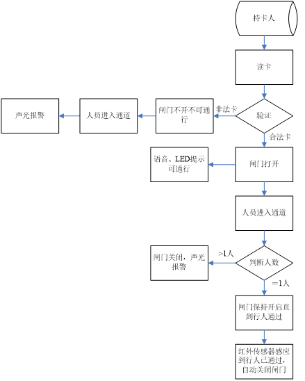6.若行人不識別進入通道時,閘門不動作禁止行人通行,同時紅外線傳感器感應(yīng)到有人非法進入通道,閘機聲光告警器鳴響告警(需增加聲光告警器),直至行人退出通道后告警解除,重新讀有效卡方允許通行。